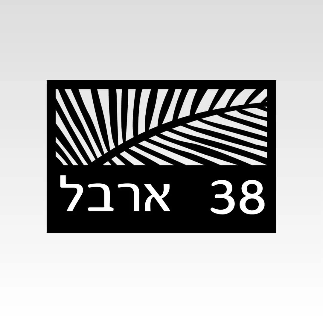 שלט אקריליק דגם עלים לדלת כניסה בעיצוב יוקרתי שחור על גבי לבן עם כיתוב בהתאמה אישית.