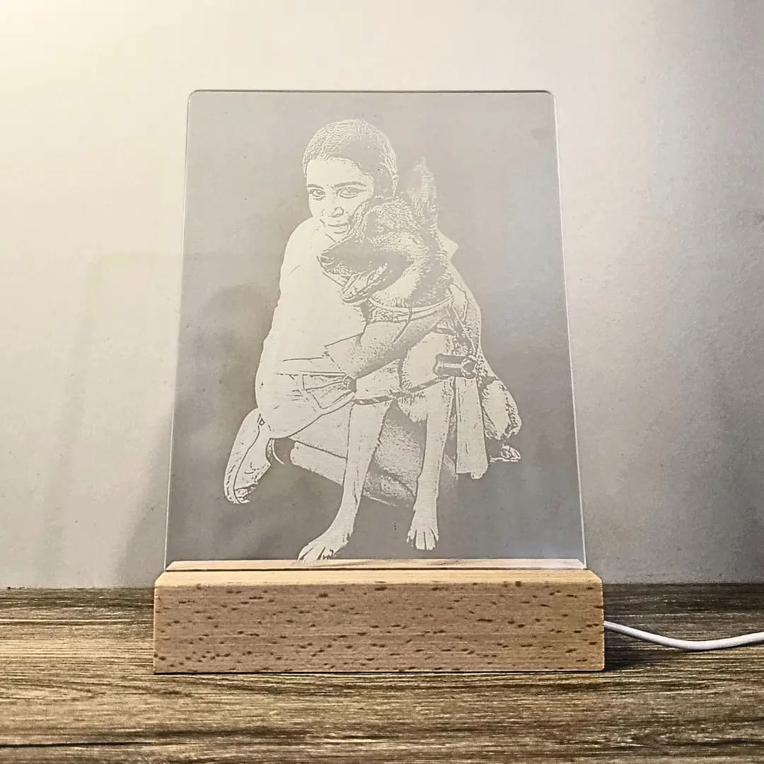 מנורה ייחודית ואישית עם חריטה של תמונה מותאמת אישית על פרספקס שקוף, מושלמת להוספת מגע אישי ומרגש לכל חדר. המנורה כוללת בסיס עץ איכותי עם אפשרות להוסיף חריטת הקדשה אישית, מה שהופך אותה למתנה מושלמת לאנשים אהובים או לתזכורת מיוחדת בביתכם. התאורה הרכה יוצרת אווירה נעימה ומדגישה את הפרטים העדינים של החריטה.