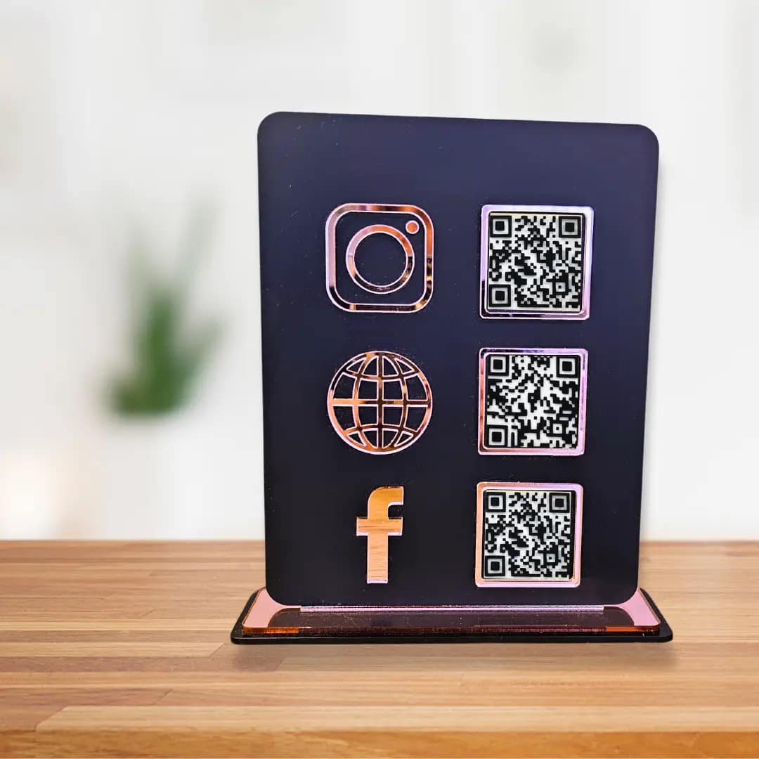 שדרגו את נוכחות העסק או המותג שלכם עם מעמד שולחני ייחודי, המותאם אישית ומכיל 2 או 3 קודי QR מובנים. מתאים להצבה על דלפקים, שולחנות קבלה, או תצוגות.