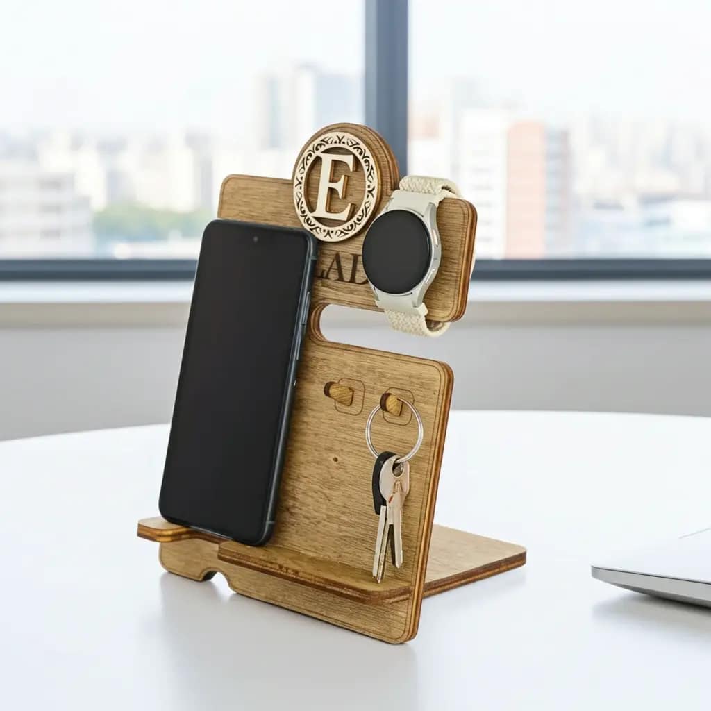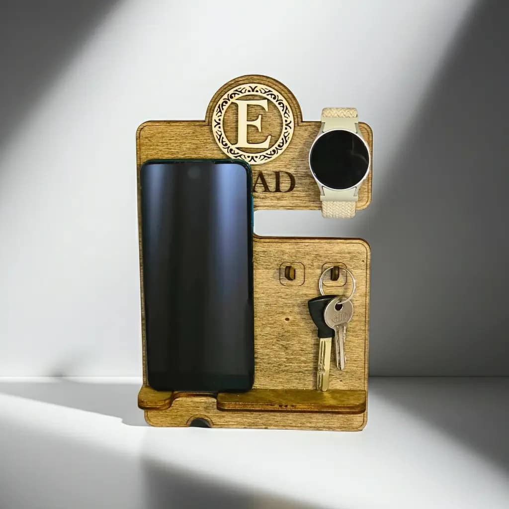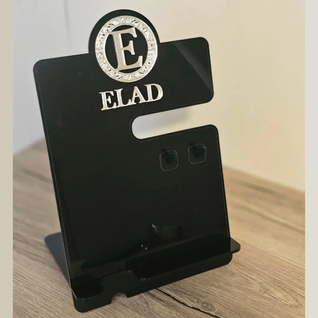 מעמד שולחני לטלפון, שעון ומפתחות – בעיצוב ייחודי מעץ או אקריליק