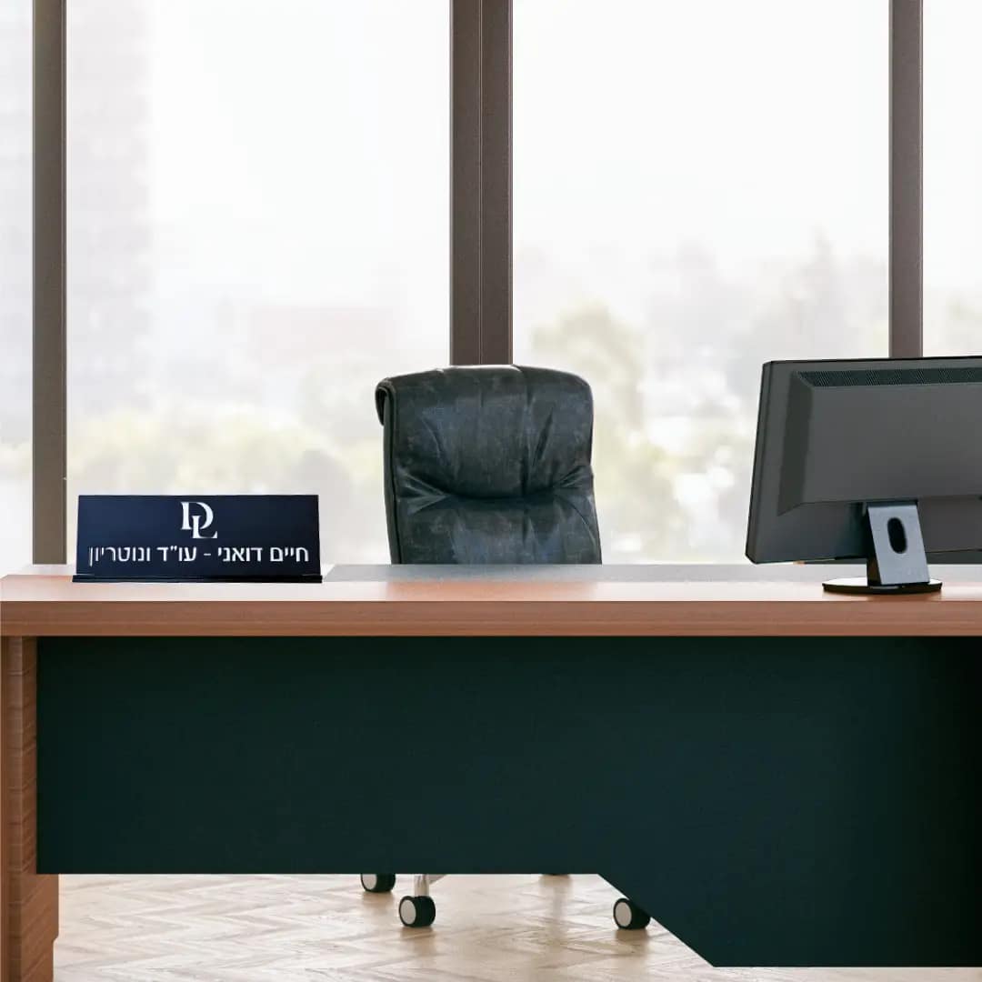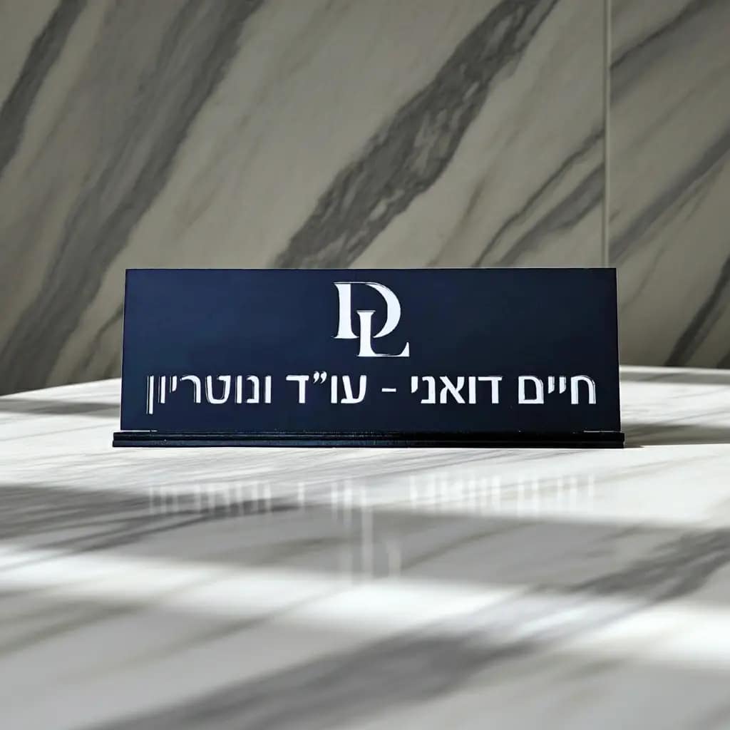 מעמד שם שולחני יוקרתי לעסקים, עשוי מ-2 שכבות אקריליק בעובי 3 מ"מ, בגודל 20×8 ס"מ. השכבה התחתונה משמשת כבסיס והשכבה העליונה מותאמת בהתאמה אישית עם כיתוב שם, לוגו או תפקיד. מתאים למשרדים, עורכי דין, רופאים ועוד. מעניק מראה מקצועי ומסודר לשולחן העבודה!