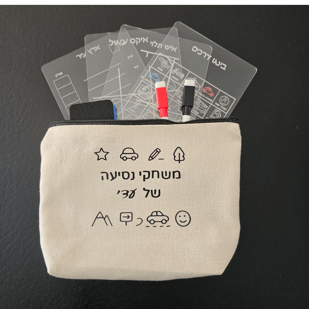 ערכת משחקים לדרך הכוללת 4 לוחות אקריליק מחיקים לבחירה, 2 טושים ומחק ספוג – הכל בתוך נרתיק ממותג וקומפקטי.