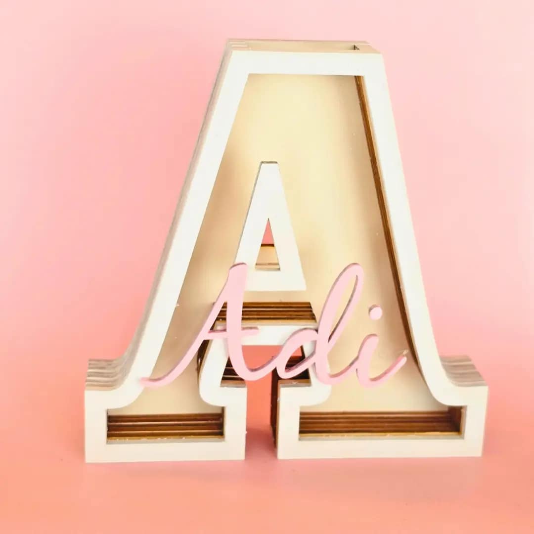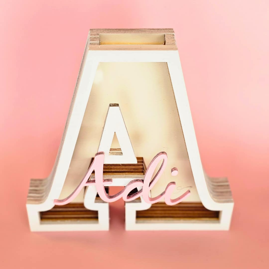 עשויה עץ איכותי בגודל 17 ס"מ, בצורת האות הראשונה של השם, עם שם מודבק מעל.
