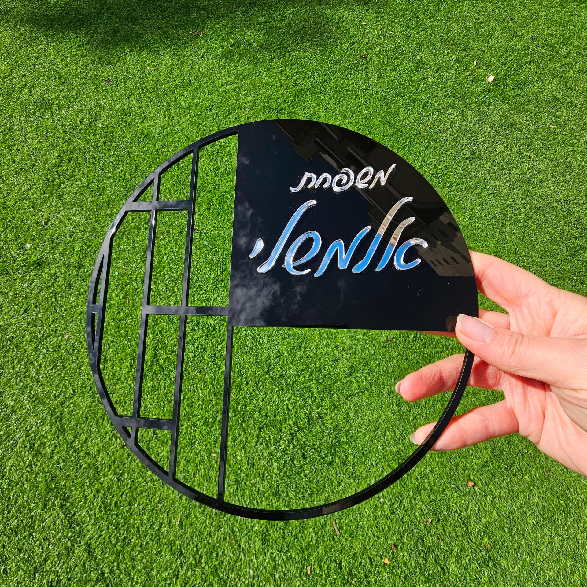 שלט אקריליק לדלת כניסה דגם עגול פסים בעיצוב יוקרתי . ניתן להתאים את הצבע ואת הכיתוב בעברית או באנגלית לפי בחירתכם (באנגלית באותיות גדולות בלבד). השלט בקוטר 23 ס"מ, עשוי אקריליק איכותי, עמיד ומעוצב בקפידה, להוספת טאץ' אישי ומרשים לדלת הכניסה שלכם.